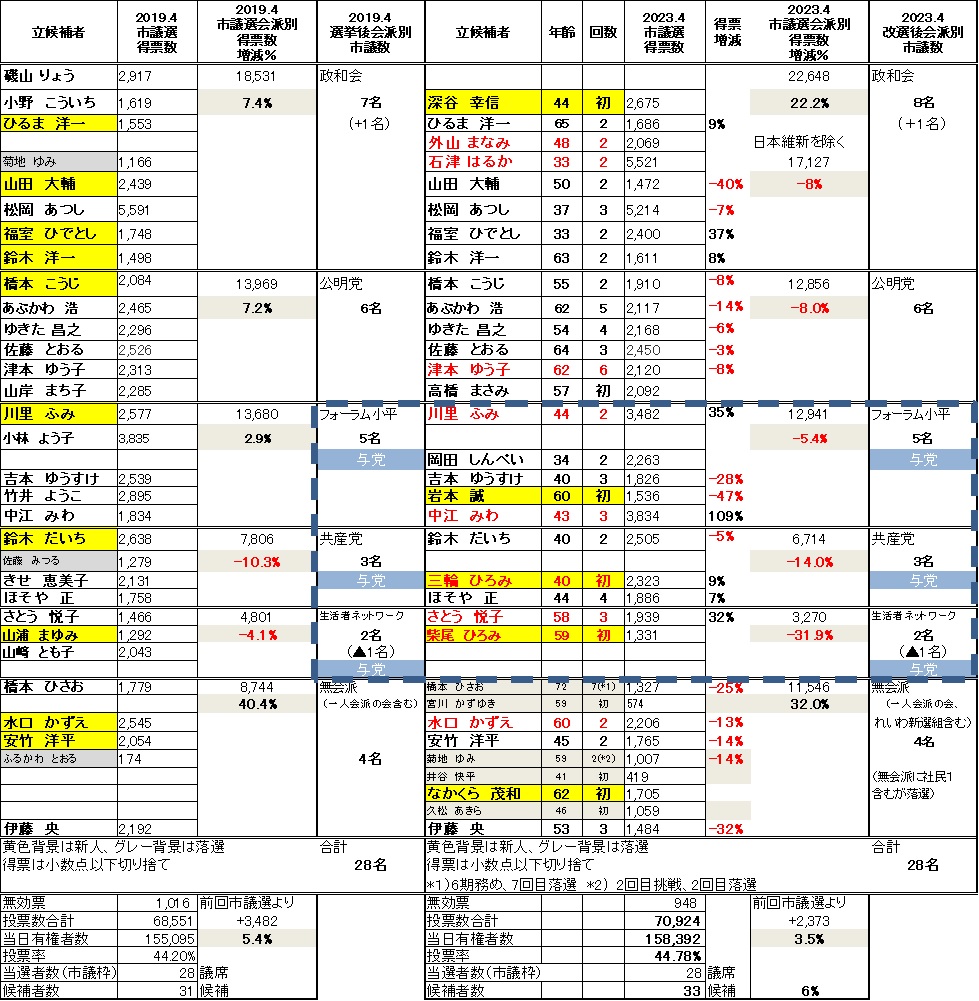 2019年4月21日 小平市市議会議員選挙結果と 立候補者公開アンケート結果